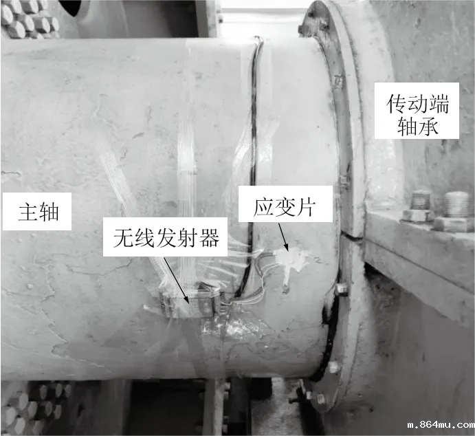 提升机轴承所受轴向力是由轴直接传递给传动侧轴承的。该轴承安装于轴承座内,轴向力不易直接测得。测量与其连接在一起的主轴的轴向力,可近似地认为是轴承的轴向力。提升机轴向力测试采用贴应变片的方法,在传动侧轴承和摩擦轮中间、靠近传动侧轴承的主轴上粘贴无线应变片,测量主轴的轴向力,进而得到传动侧轴承轴向力的近似值。具体测试过程如下。