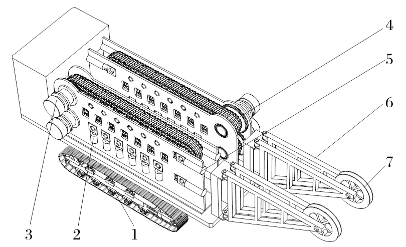 对更换钢丝绳中换绳机构的研究,国内外学者作出了大量贡献。王峰提出使用步进移动机构进行送绳。该机构由数根步进液压缸和与液压缸相连接的送绳小车组成,液压缸伸出推动小车送绳,每次送绳长度相同。樊鹏提出一种链传动连续送绳机构,此机构将链轮的旋转运动转化为钢丝绳的直线运动。该送绳方式虽然可以实现钢丝绳的连续送绳,但是当两个链轮速度不一致时,会出现钢丝绳的打滑、堆积以及双边送绳不同步等问题。申心雨设计了一种履带牵引式连续送绳装置,此装置与链传动连续送绳机构一样,并没有解决当链轮速度不一致时产生的问题。德国西马格特宝公司研制了一种滚筒送绳机构,该机构通过摩擦把滚筒上的力传递到钢丝绳上进行连续送绳,整体可靠性较高,但是由于装备过大,结构复杂,推广难度大。