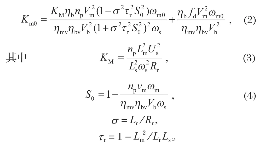 式中:np 为电动机的极对数;Vm 为液压马达的排量;ωs 为电网供电频率;Ls、Lr、Lm 分别为定子电感、转子电感以及定子与转子之间的互感;Us 为端电压。