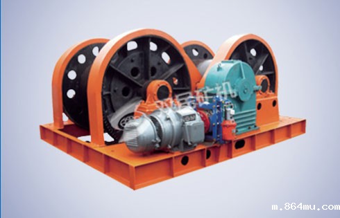主要结构机械部分:主轴装置、减速器、联轴器、制动器、液压站、深度指示器及其传动装置、测速发电机装置、护板、护罩、护栏。辅助机械部分:司机椅子、导向轮和天轮、车槽装置。电器部分:主电机及电气拖动装置、电器控制装置、电器保护装置。电动机通过减速器驱动卷扬筒旋转,钢丝绳一端固定在卷筒上,另一端经卷筒缠绕后,通过井架天轮悬挂提升容器。随着卷筒的旋转,实现容器的上升和下放。