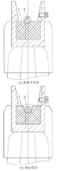 天轮装置在返厂修复时,天轮衬垫磨损一般出现2 种情况 (见图 9),衬垫磨损左右不对称和衬垫深度方向磨损超限。分析其原因:衬垫左右磨损不对称是因为天轮装置与主轴装置不对中所致;衬垫磨损严重直接原因是钢丝绳与衬垫发生了相对运动,钢丝绳打滑,轮缘偏摆较大也是原因之一。