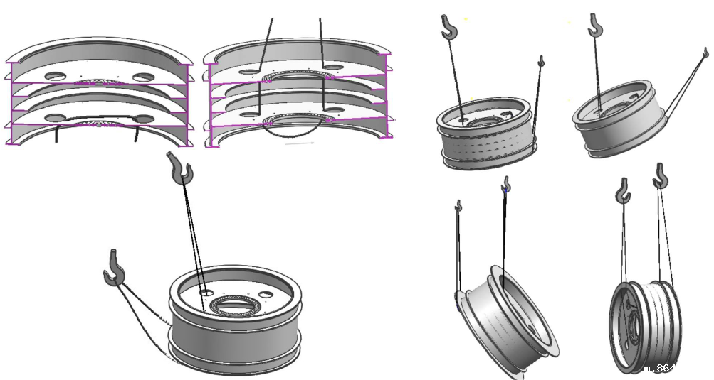 吊点附近的轮子轮缘之间,需用螺纹千斤顶辅助支撑,以防止在起吊中变形;起吊翻转过程中人员与工件要保持足够的安全距离,避免千斤顶坠落伤人。