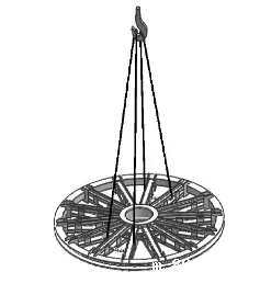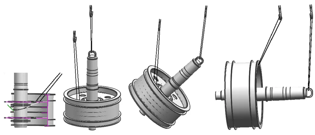 采用两根钢丝绳,主钩钢丝绳从上方腹板中一人孔穿入,绕过主轴,从同一人孔穿出。副钩钢丝绳通过工装吊盘,吊在主轴上方,起辅助调平作用。主轴两端的螺钉孔仅用于把吊具,不能直接把吊环螺钉起吊。