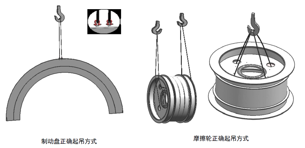采用两根等长钢丝绳,左、右侧各挂一根钢丝绳,吊点在由上到下第三个轮子的上、下槽钢中间空隙处,不准许直接兜吊下侧槽钢。此种起吊方式严禁带轴承座及端盖。