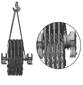 4m以下规格天轮装置:采用两根等长钢丝绳。钢绳兜吊中间两个轮子的轮缘,两根钢丝绳分别挂在同一处槽钢的左、右两侧。为防止轮子变形,两吊挂轮子之间需用千斤顶支垫。