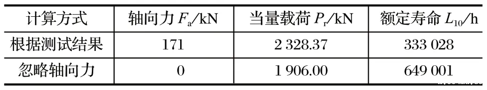 根据传统方法得到轴向力为 0 kN,测试方法得到轴向力为 171 kN。按照轴承寿命计算公式,利用两方法分别计算,其结果如表2 所列。