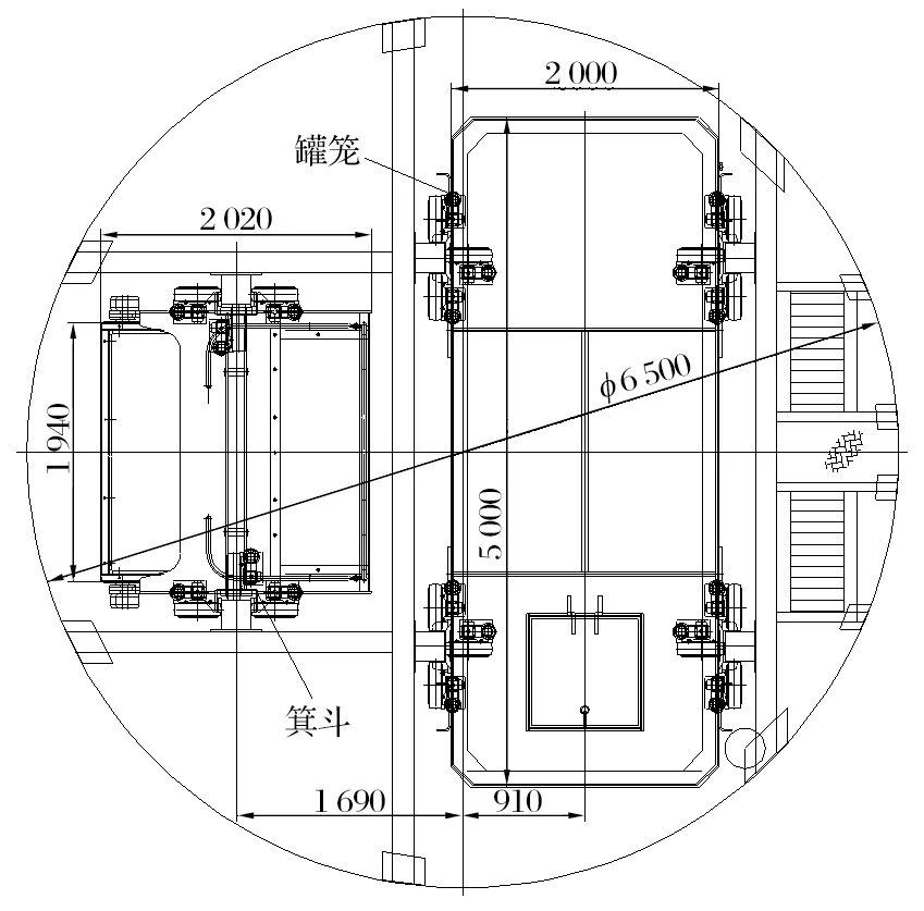 会泽矿业分公司3号竖井的井筒直径为6.5 m,井筒布置为1台箕斗配合1台罐笼的混合提升方式。箕斗断面为1 940 mm×2 0.0mm,罐笼断面为5 0.0mm×2 0.0mm,井筒布置如图1所示。箕斗有效容积为13 m3,zui大载重 30.35t,自重 38 t,4 根尾绳总质量为118.39 t,因此箕斗终端载荷为186.74 t。罐笼配合箕斗提升,自重 38 t,4 根尾绳总质量为118.39 t,罐笼采用双层结构。