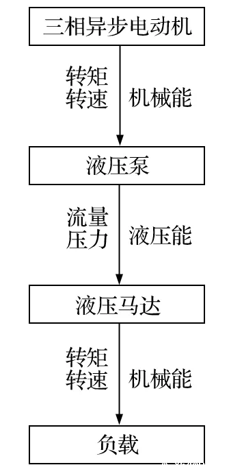 换绳机构采用双液压马达驱动,以带动同步带轮和链轮转动,进行送绳,其能量传递过程如图3所示。在整个能量传递中,受排量、效率、液压等因素的影响,液压马达输出转矩会产生波动。因此,需要通过公式推导得出输出转矩的波动函数。